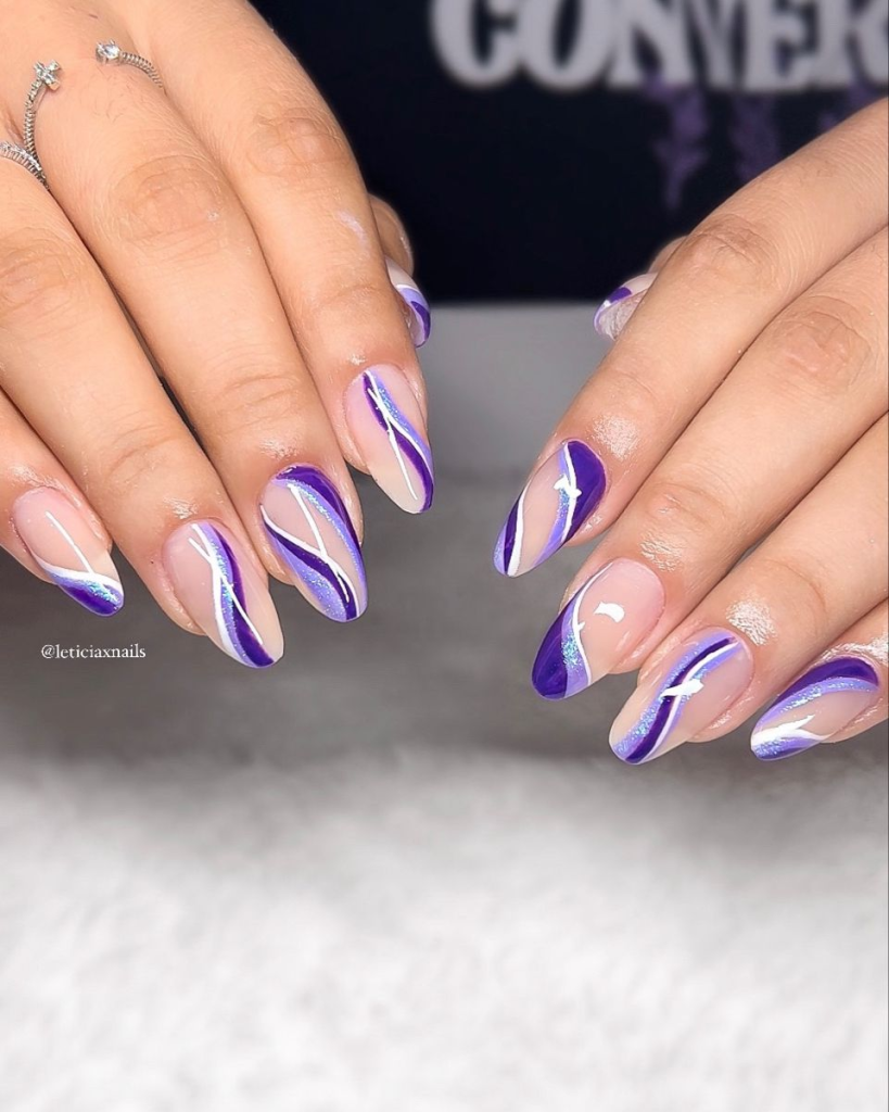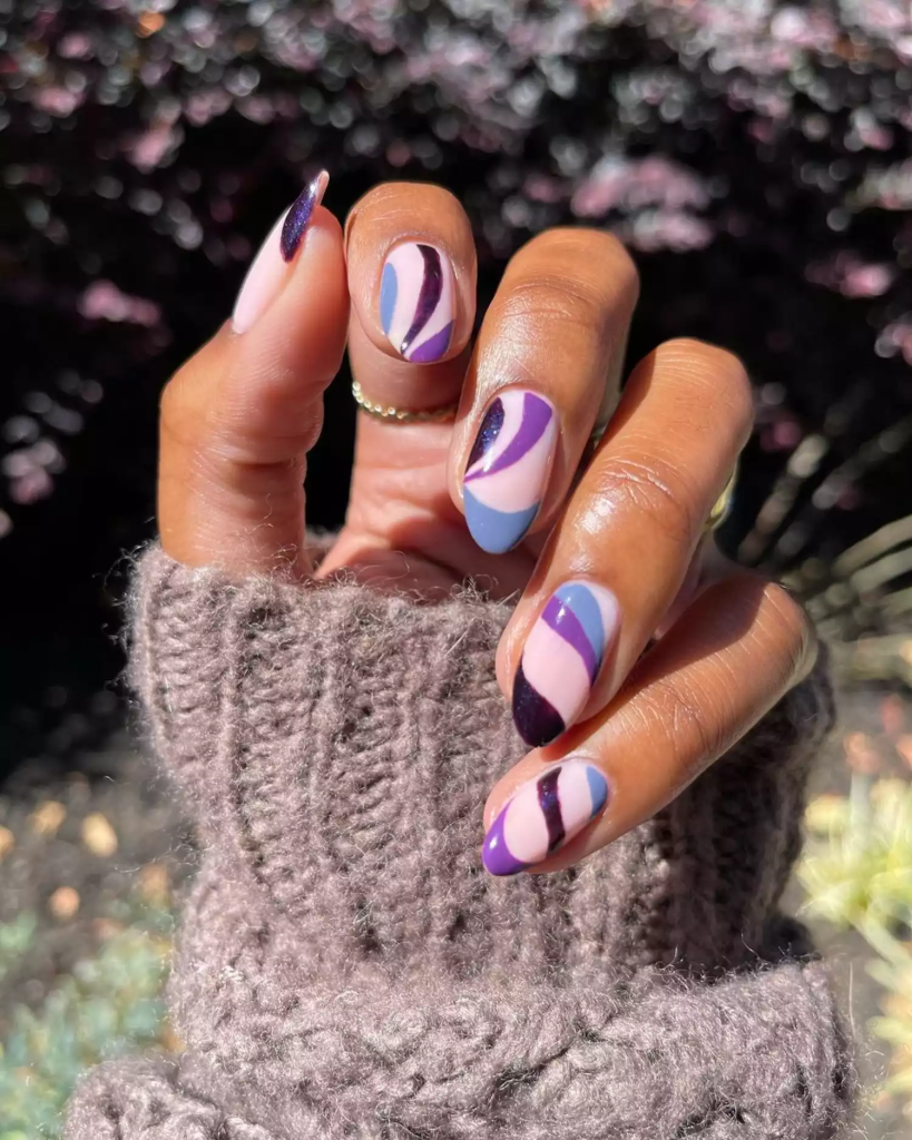 If you prefer a more artistic look, a negative space French manicure with purple accents is your best bet. Instead of painting your entire nail, leave parts of it bare for a modern, airy feel. Mixing light lilac and deep plum shades creates a playful monochromatic effect.