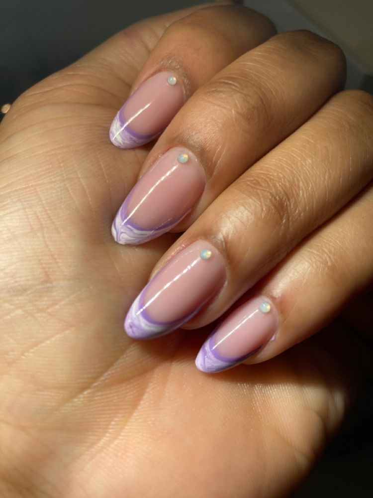 Why settle for a straight French line when you can go asymmetrical? A modern lavender-tipped design instantly upgrades the traditional look. The diagonal or curved lines add movement, creating a soft, artistic effect. This style works beautifully on almond or oval nail shapes, giving your hands an elongated, elegant appearance.