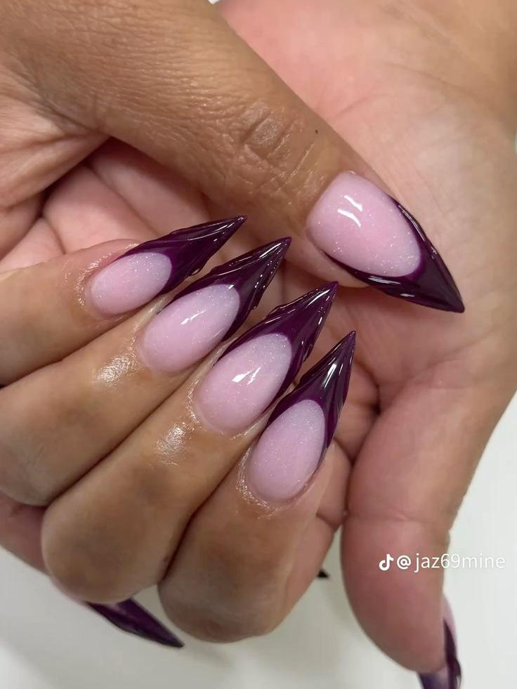 If you’re into the “glazed” or “jelly” nail trend, try translucent purple French tips for a juicy, candy-like effect. The glossy finish gives a youthful vibe while still keeping it sophisticated thanks to the dark hue. Add a dusting of fine glitter if you want to make them sparkle.