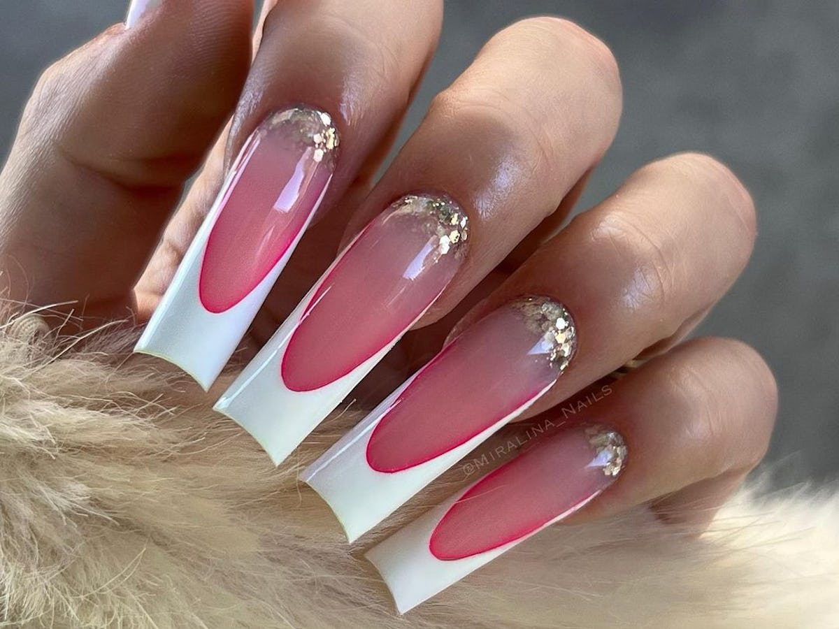 Add a touch of glamour by swapping white tips for glittery polish. Silver, gold, or holographic glitter tips catch the light and make your nails stand out at any event.