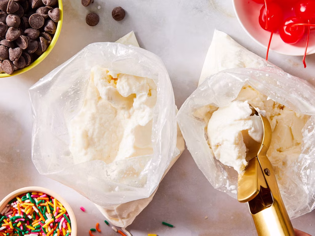 Mix milk, sugar, and flavouring in a sealed bag, then place it inside another filled with ice and salt. Shake until it freezes — instant ice cream.