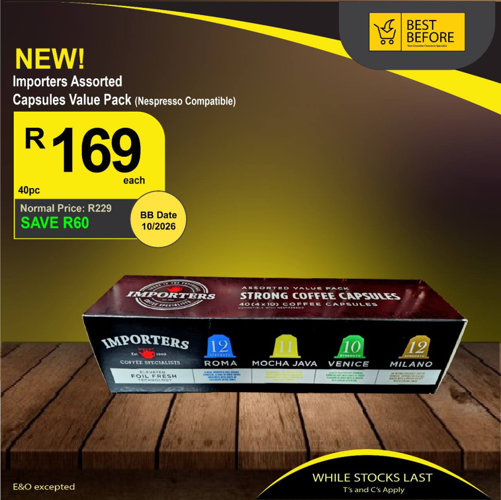 - Importers Assorted Capsules Value Pack (Nespresso Compatible) – Was R229, now only R169, save R60.