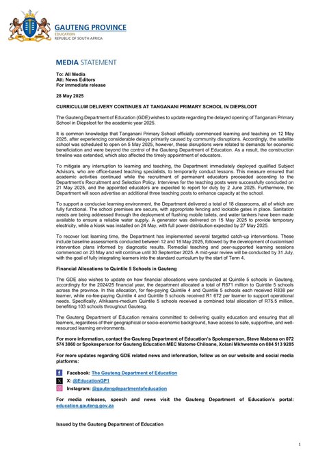 The Gauteng Department of Education is urgently restoring order to the school curriculum after significant delays disrupted the start of the 2025 academic year at Tanganani Primary School in Diepsloot. They have launched catch-up and remedial initiatives to align with the standard school curriculum. Moreover, a mid-year review is scheduled to ensure all learners fully integrate into the standard curriculum by the fourth term.