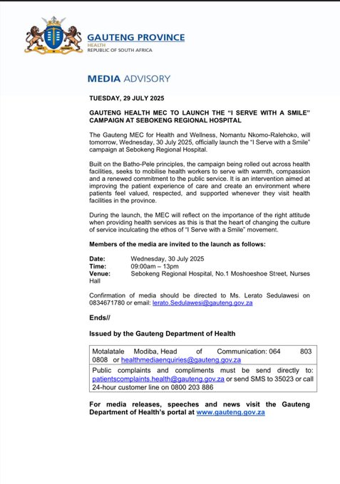 On Wednesday, 30 July 2025, the Gauteng MEC for Health and Wellness, Nomantu Nkomo-Ralehoko, will officially launch the highly anticipated “I Serve with a Smile” campaign at Sebokeng Regional Hospital. Rooted in the Batho-Pele principles, this initiative seeks to transform the healthcare experience for patients throughout Gauteng.