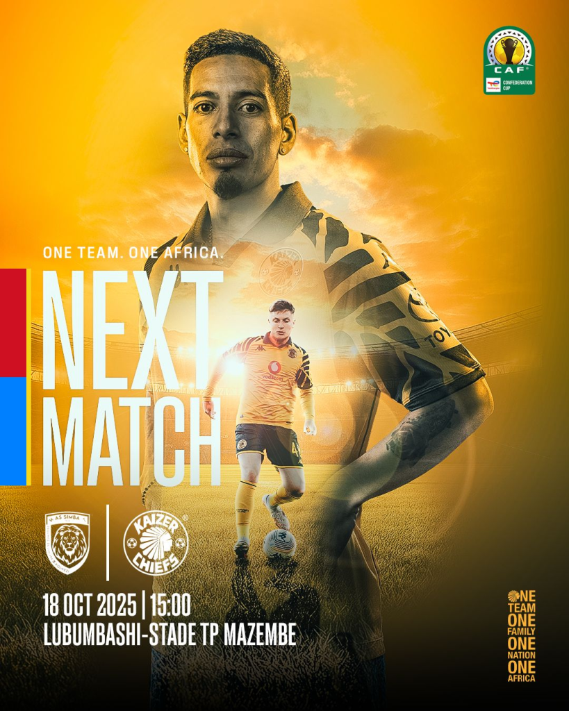 Kaizer Chiefs are preparing for a pivotal double-header in the second preliminary round of the 2025/26 TotalEnergies CAF Confederation Cup. Chiefs will face AS Simba of the Democratic Republic of Congo in confirmed fixtures for CAF. They will play the first leg on Saturday, 18 October, at TP Mazembe Stadium in Lubumbashi, before hosting the return leg. The decisive return leg will take place on Sunday, 26 October, at Dobsonville Stadium in Soweto, completing the two-legged tie.