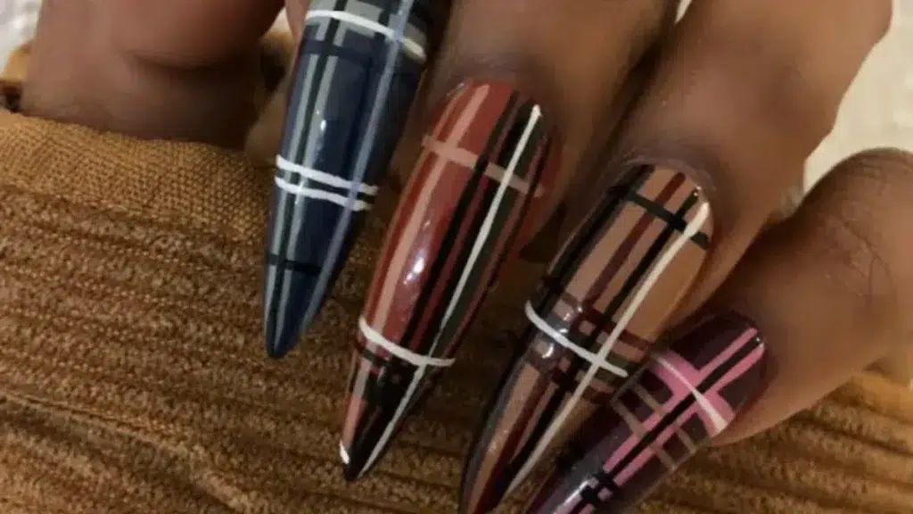 Plaid nail art channels cozy winter scarves. Use colours that show up in your winter wardrobe, for a classic seasonal vibe.