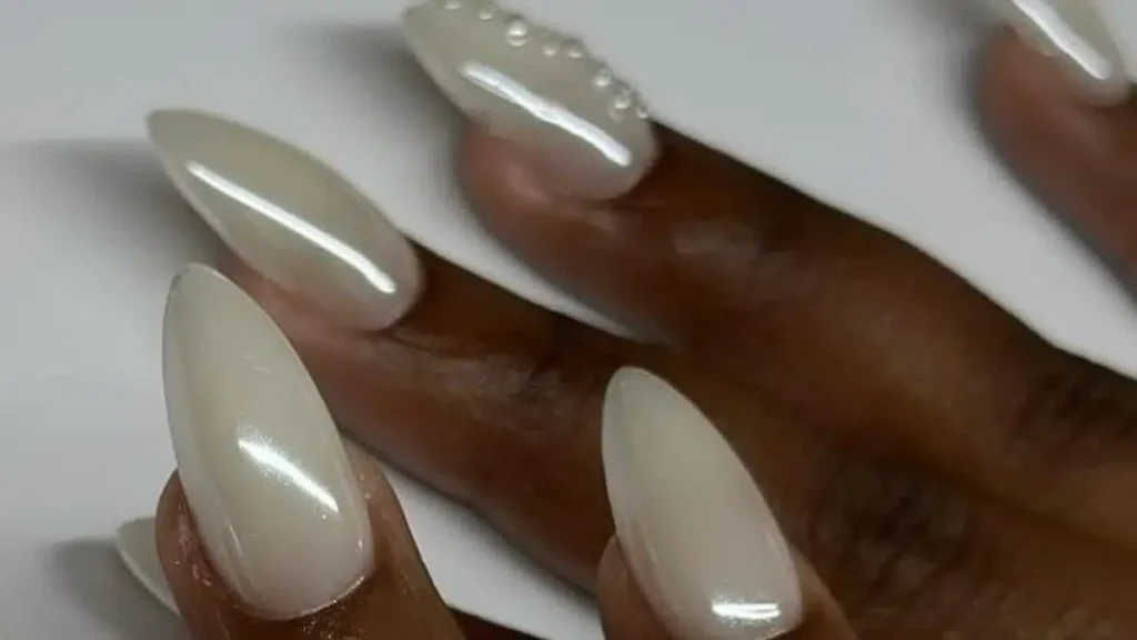 Pearl white polish shines softly and resembles fresh snow. It’s understated and classy.